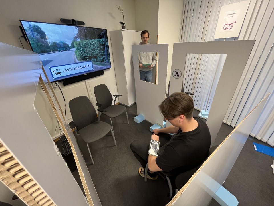 The first phase was a Wizard-of-Oz simulation at the school, using a self-built cardboard bus and a TV screen to simulate the journey in a familiar environment. Once the interaction proved understandable in that setting, the second phase was carried out on the actual bus.