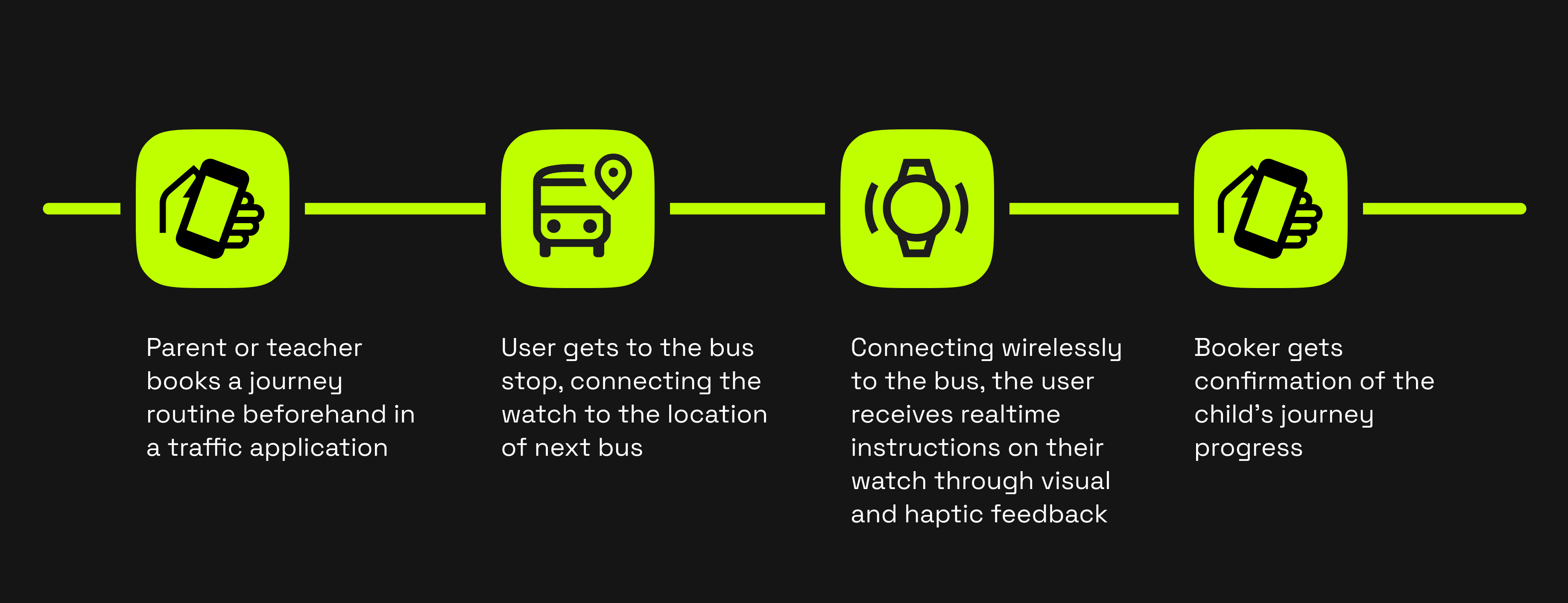 The final concept was a smartwatch-based support system for autonomous bus travel. A journey is pre-programmed in advance by a parent or teacher using a start point and destination, rather than a fixed departure time.