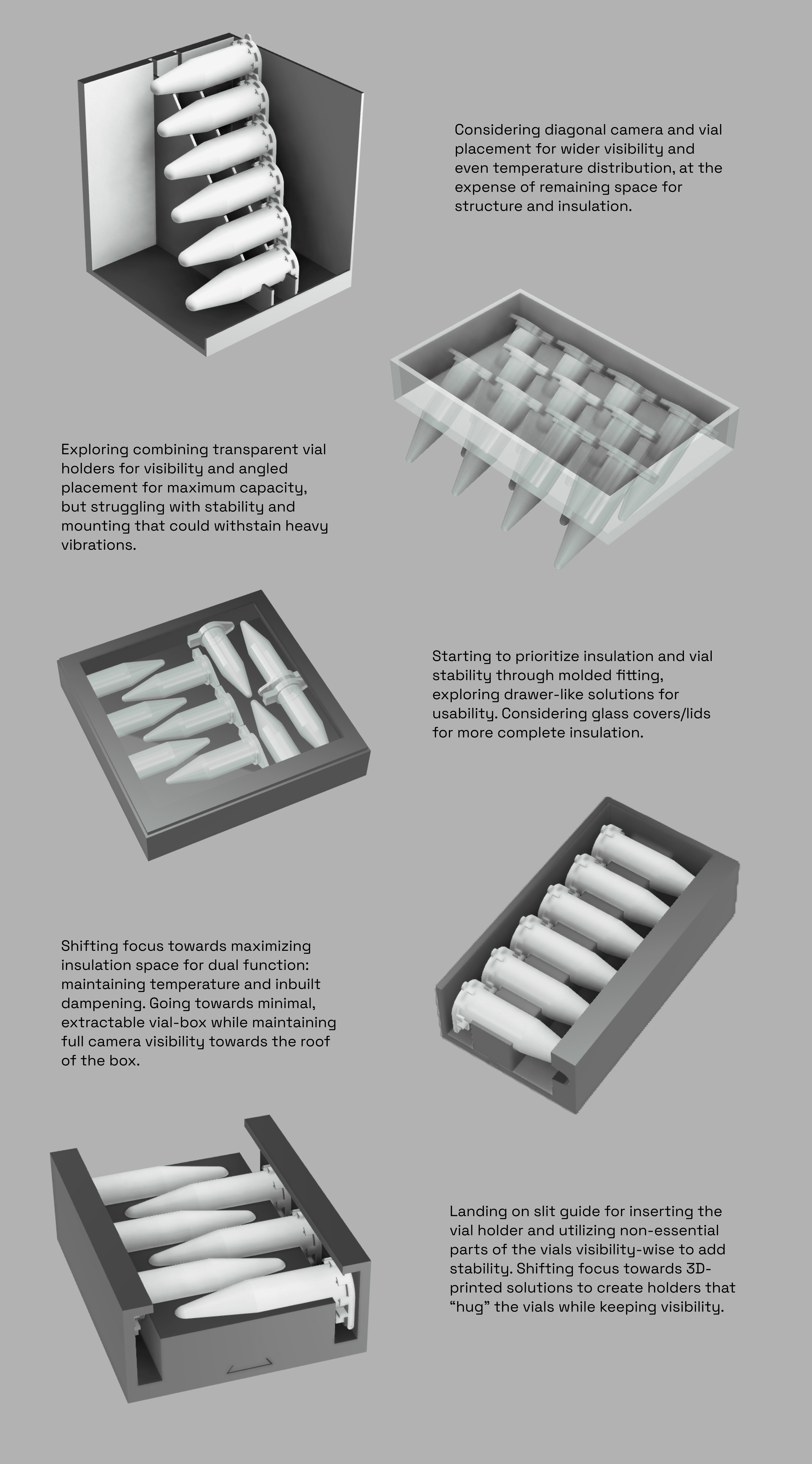 Early ideation established what direction our design had to take in order to enable us to adress all requirements. The initial concepts had to adress how the vials should be placed.