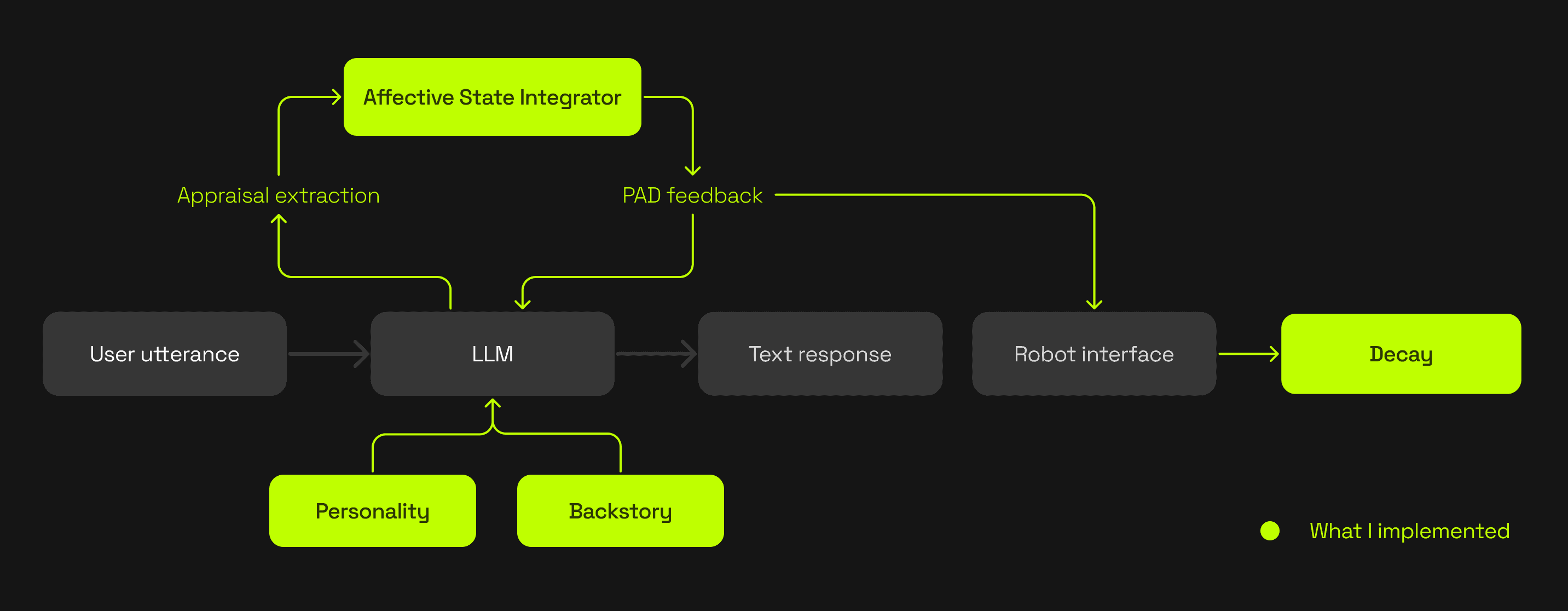 As Roboguide moved into more open-ended conversations, expressive animations alone were not enough to maintain a coherent character. In my master’s thesis, I explored how personality traits, narrative framing, and internal affect could be turned into a system that shaped both what the robot said and how it expressed itself.